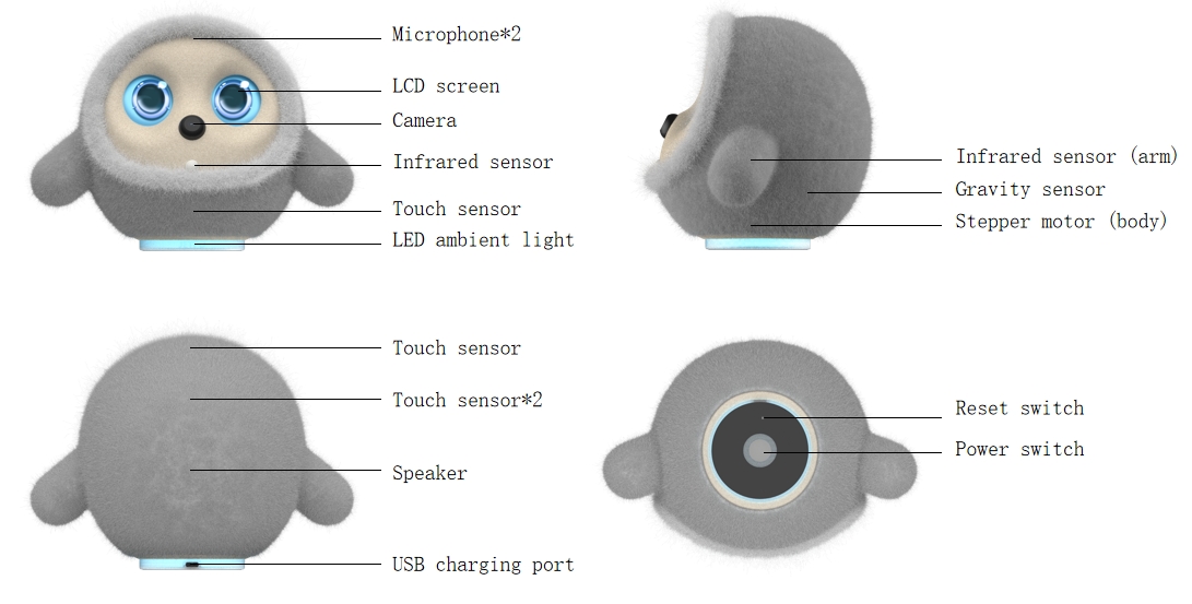 | Ekran ekspresji LCD | Ekran LCD o przekątnej 4,28 cala (oczy), obsługuje wyświetlanie dynamicznej ekspresji i wyświetlanie obuoczne (np wizualne sprzężenie zwrotne podczas „udawania martwego” lub „udawania uroczego”). |
