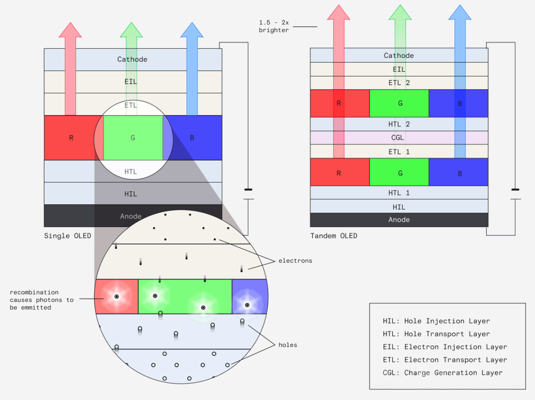 Dodatkowo wielowarstwowa struktura tandemowa łączy wiele jednostek emitujących światło za pośrednictwem warstwy generującej ładunek (CGL), zwiększając jasność i wydłużając żywotność urządzenia. Technologie te doprowadziły do powstania popularnych rozwiązań do masowej produkcji, takich jak WOLED i QD-OLED.