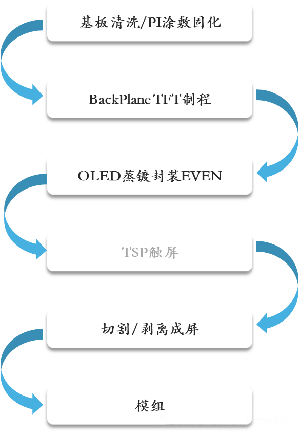 Podstawowy proces produkcyjny AMOLED obejmuje kilka wysoce technicznych procesów jednostkowych. W procesie Backplane TFT (BP) technologia niskotemperaturowego krzemu polikrystalicznego (LTPS) stała się głównym nurtem ze względu na wysoką ruchliwość elektronów. Proces struktury górnej bramki obejmuje takie etapy, jak osadzanie warstwy buforowej, implantacja jonów kanałowych, krystalizacja przez wyżarzanie laserowe (ELA), napylanie metalem bramki i implantacja źródła-drenu. Gazy specjalne odgrywają kluczową rolę w osadzaniu, modyfikacji i trawieniu cienkich warstw: na przykład w procesach PECVD wykorzystuje się SiH₄/N₂O/NH₃ do osadzania cienkich warstw a-Si/SiNx/SiOx; Osadzanie warstwy atomowej (ALD) wykorzystuje TMA i H₂O do utworzenia warstw kapsułkujących Al₂O3; Trawienie na sucho umożliwia uzyskanie bardzo precyzyjnych wzorów za pomocą gazów takich jak CF4/SF6/Cl2, gdzie BCl3 stosuje się do redukcji warstw tlenków metali, a Cl2 generuje lotne produkty trawienia, zapewniając czysty i wydajny proces.