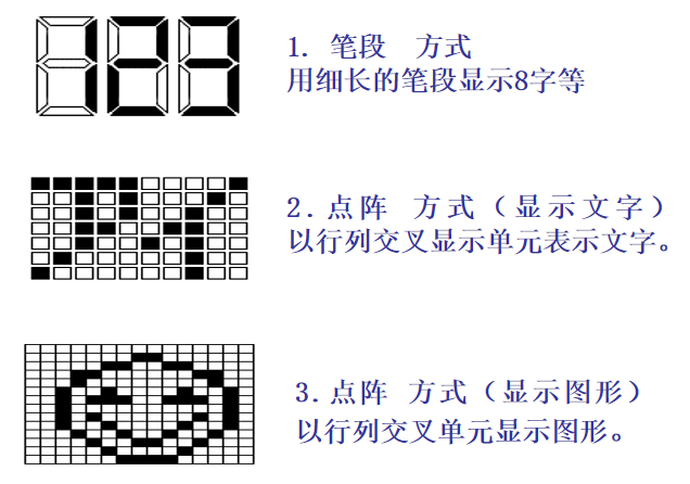 Wyświetlacze segmentowe:Dzięki swojej prostej i niedrogiej charakterystyce specjalizują się w wyświetlaniu cyfr, liter i prostych ikon. Stanowią klasyczny wybór do urządzeń takich jak przyrządy pomiarowe i podstawowy sprzęt AGD.