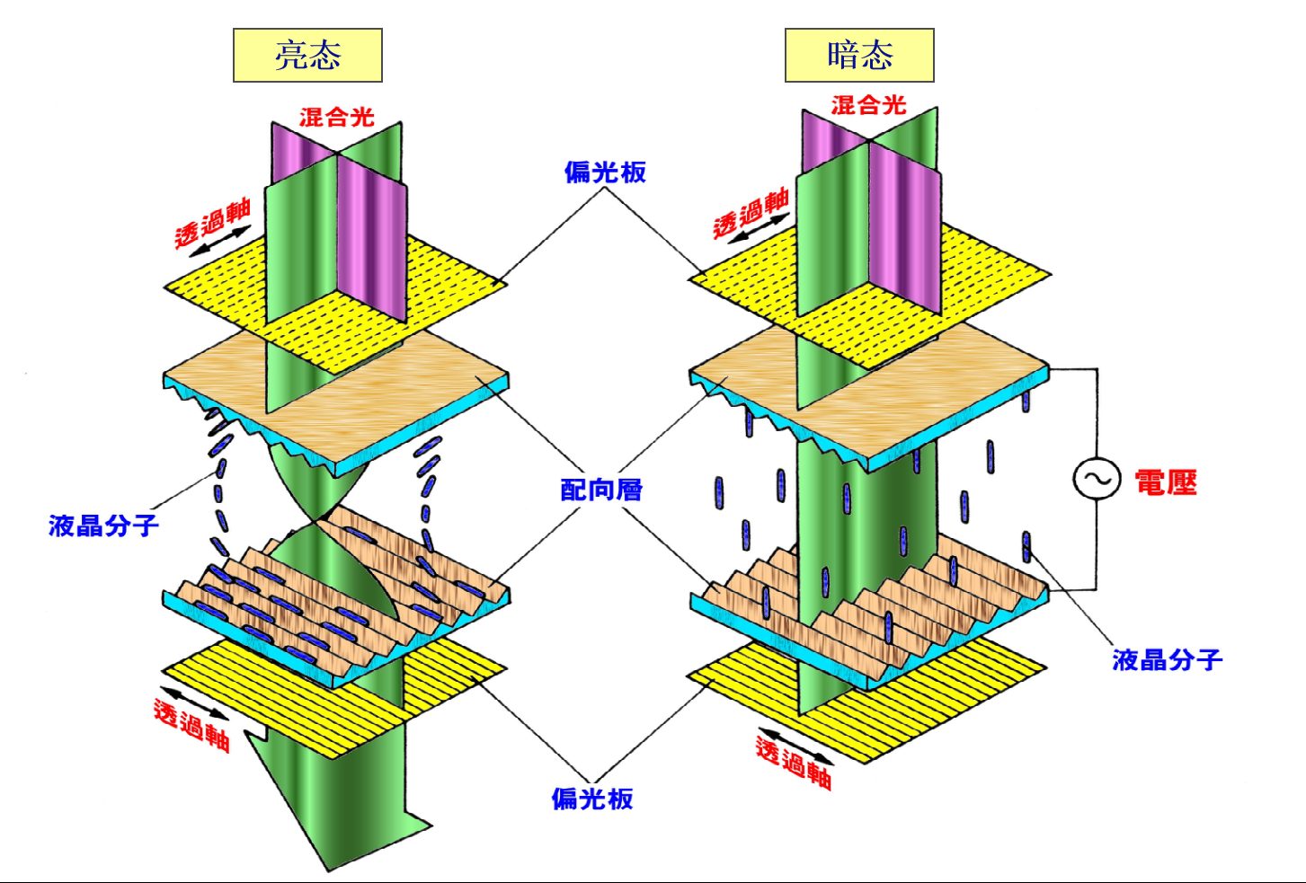W stanie jasnym (bez wyświetlania) cząsteczki ciekłego kryształu utrzymują regularny układ skręcony pod kątem 90 stopni. Padające światło ulega polaryzacji po przejściu przez oś transmisyjną przedniego polaryzatora. Gdy spolaryzowane światło przechodzi przez warstwę ciekłokrystaliczną, jego kierunek polaryzacji obraca się o 90 stopni wraz ze strukturą skrętu molekularnego, wyrównując się z osią optyczną tylnego polaryzatora i przechodząc, tworząc stan jasny.