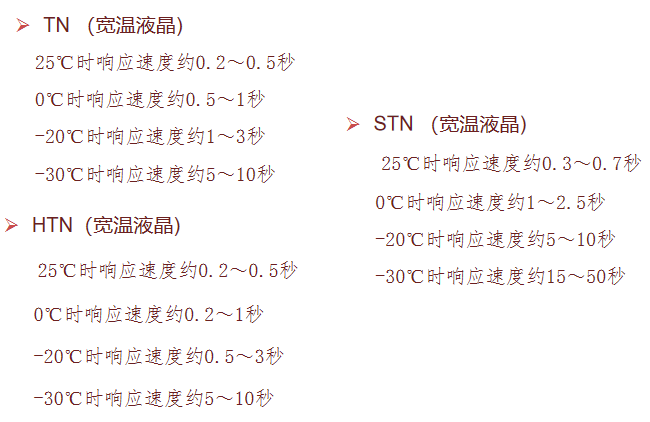 Wydajność w temperaturze pokojowej: W temperaturze 25°C czas reakcji produktów TN/HTN zazwyczaj mieści się w zakresie 150–300 milisekund, podczas gdy produkty STN, ze względu na większe kąty skręcenia molekularnego, są nieco wolniejsze, około 200–350 milisekund. Jest to wystarczające w przypadku większości potrzeb związanych z wyświetlaniem statycznym lub powolnym odświeżaniem.