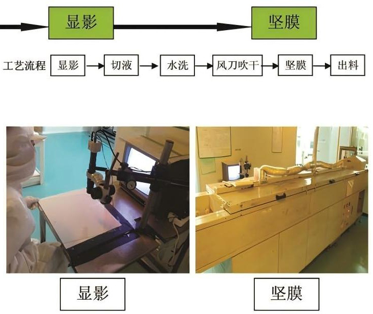 Powierzchnię szkła traktuje się wywoływaczem w celu usunięcia odsłoniętego i rozłożonego fotomaski. Na tym etapie zaprojektowany wzór elektrody staje się po raz pierwszy widoczny w postaci pozostałej fotomaski, odsłaniając kontury wzoru.